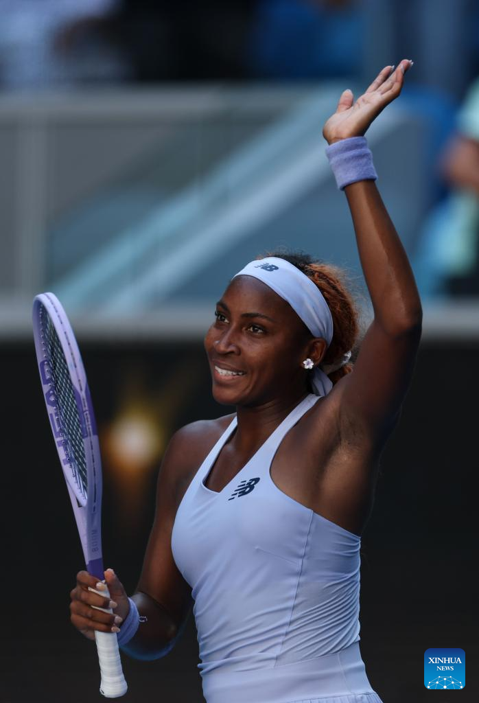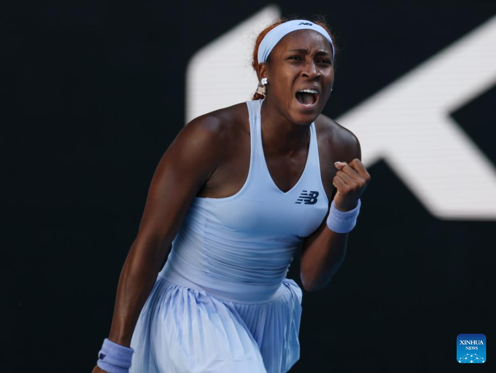 Coco Gauff of the United States celebrates after winning the women's singles 3rd round match against Hailey Baptiste of the United States at the Australian Open tennis tournament in Melbourne, Australia, Jan. 23, 2026. (Xinhua/Ma Ping)