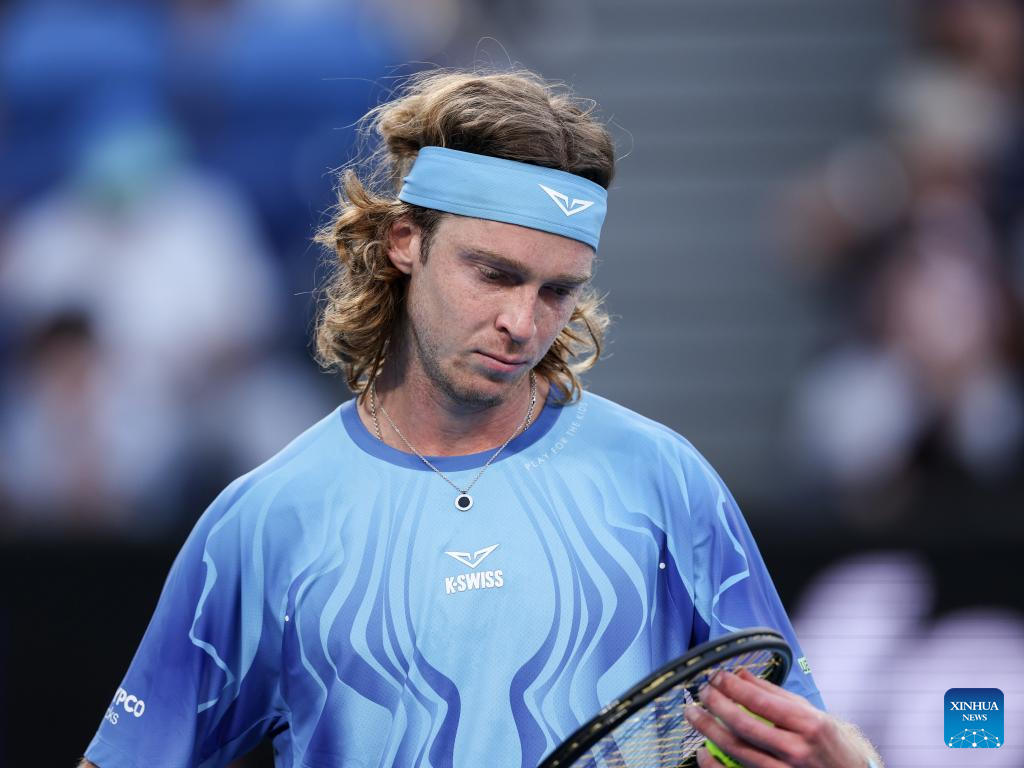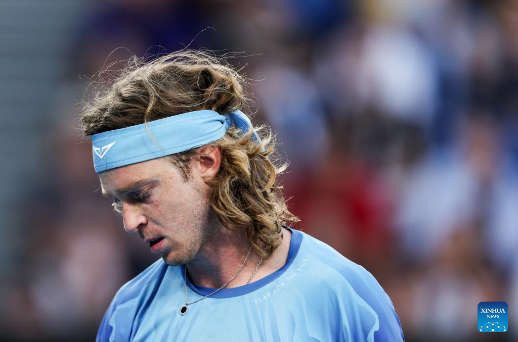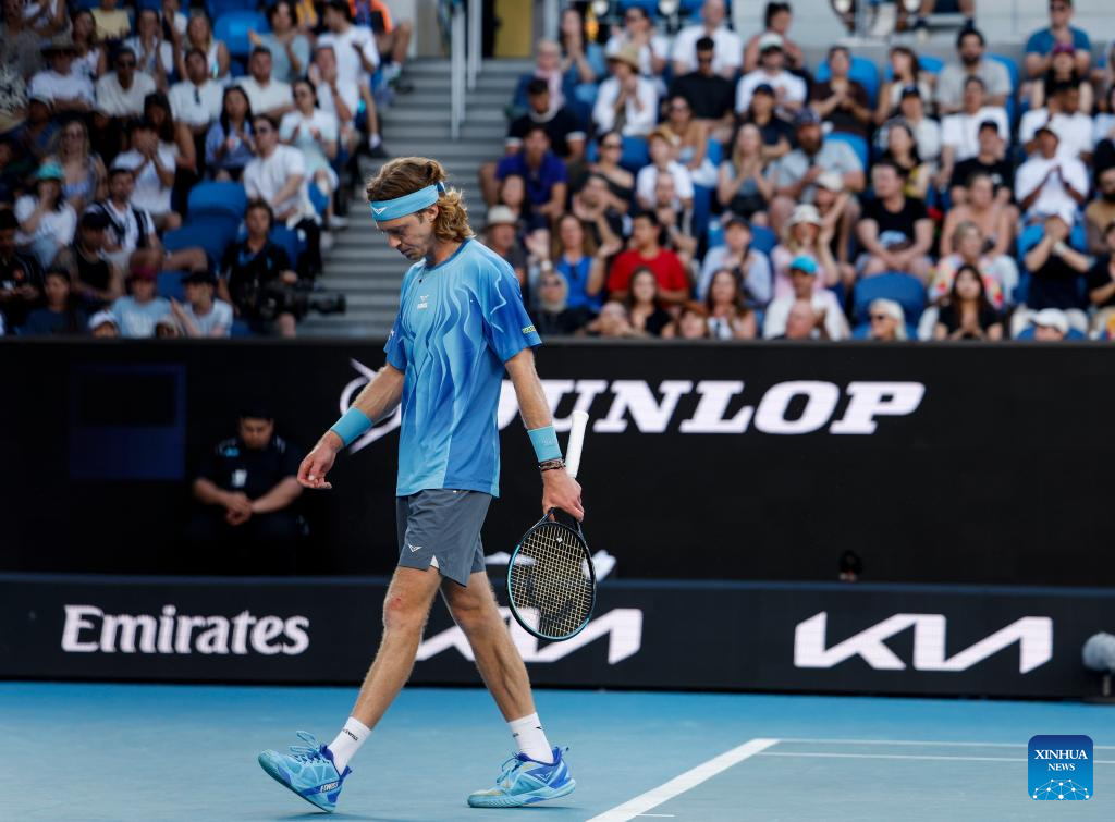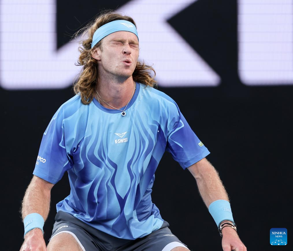 Andrey Rublev reacts during the men's singles 3rd round match between Andrey Rublev of Russia and Francisco Cerundolo of Argentina at the Australian Open tennis tournament in Melbourne, Australia, Jan. 23, 2026. (Xinhua/Ma Ping)