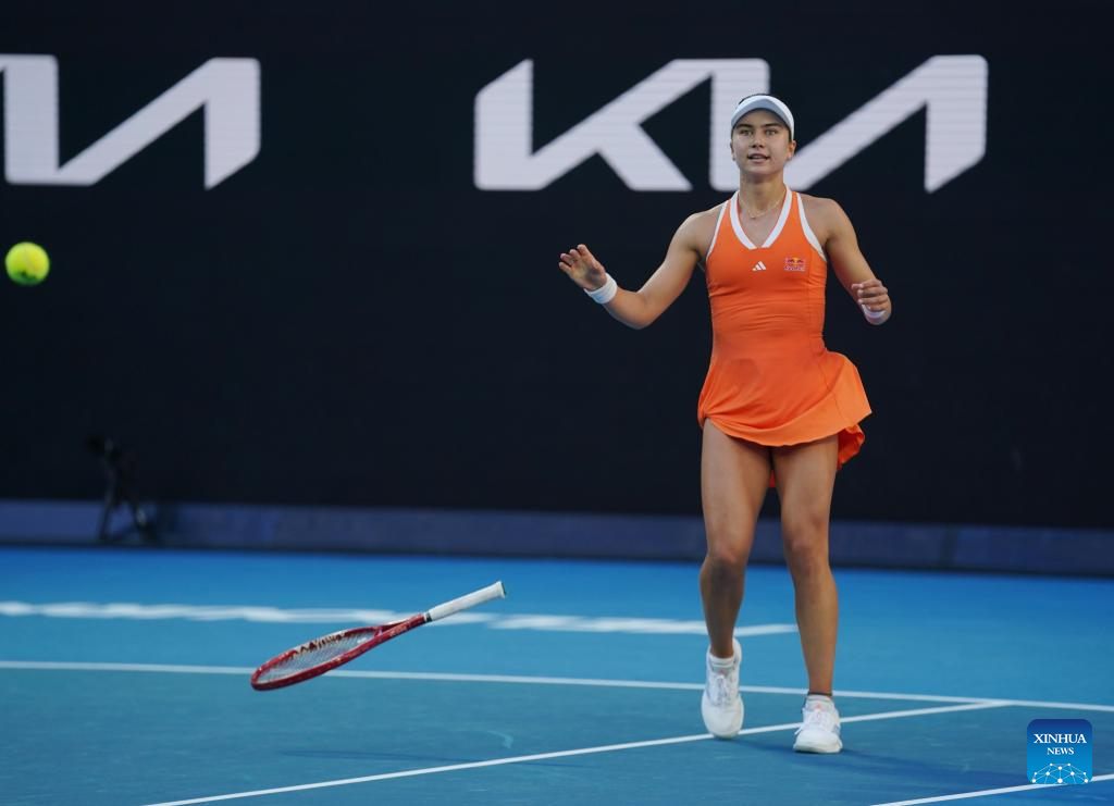 Iva Jovic of the United States celebrates after winning the women's singles 3rd round match against Jasmine Paolini of Italy at the Australian Open tennis tournament in Melbourne, Australia, Jan. 23, 2026. (Photo by Wang Shen/Xinhua)