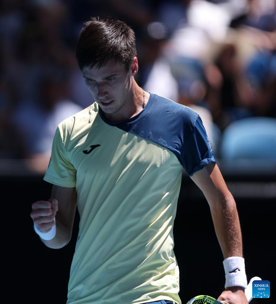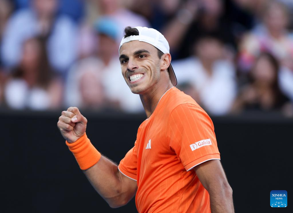 Francisco Cerundolo celebrates during the men's singles 3rd round match between Andrey Rublev of Russia and Francisco Cerundolo of Argentina at the Australian Open tennis tournament in Melbourne, Australia, Jan. 23, 2026. (Xinhua/Ma Ping)