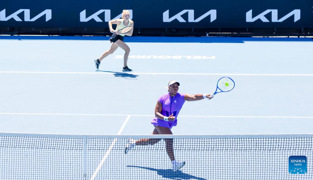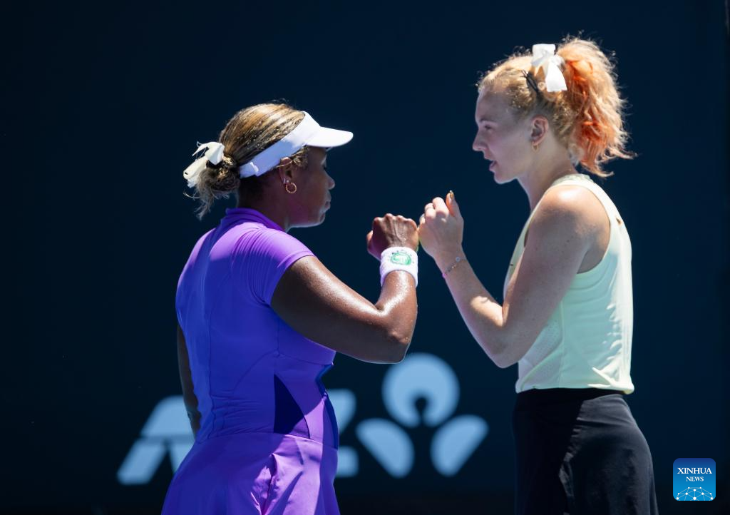 Taylor Townsend(R)/Katerina Siniakova compete during the women's doubles 2nd round match against Xu Yifan/Yang Zhaoxuan of China at the Australian Open tennis tournament in Melbourne, Australia, Jan. 23, 2026. (Photo by Hu Jingchen/Xinhua)