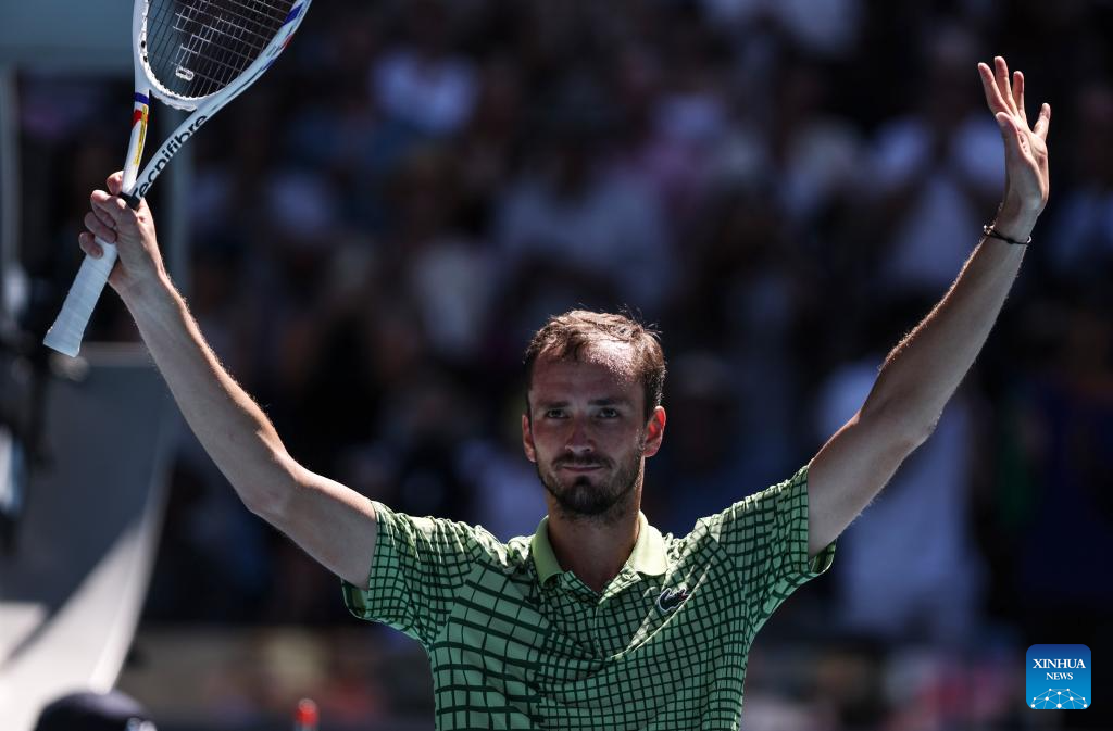 Daniil Medvedev of Russia celebrates after winning the men's singles 3rd round match against Fabian Marozsan of Hungary at the Australian Open tennis tournament in Melbourne, Australia, Jan. 23, 2026. (Xinhua/Ma Ping)
