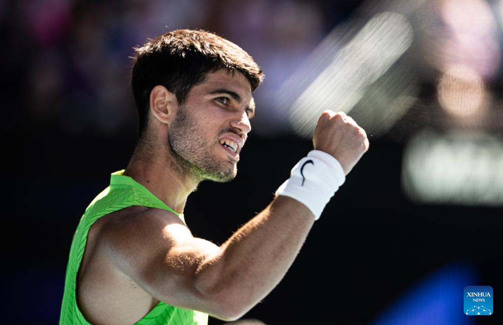 Carlos Alcaraz of Spain celebrates winning after the men's singles 3rd round match against Corentin Moutet of France at the Australian Open tennis tournament in Melbourne, Australia, Jan. 23, 2026. (Photo by Hu Jingchen/Xinhua)