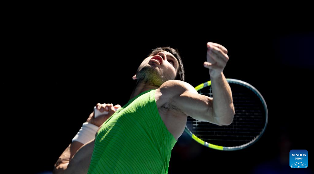Carlos Alcaraz of Spain serves during the men's singles 3rd round match against Corentin Moutet of France at the Australian Open tennis tournament in Melbourne, Australia, Jan. 23, 2026. (Photo by Hu Jingchen/Xinhua)
