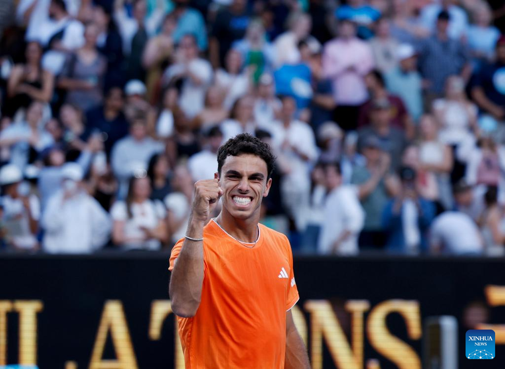 Francisco Cerundolo celebrates after the men's singles 3rd round match between Andrey Rublev of Russia and Francisco Cerundolo of Argentina at the Australian Open tennis tournament in Melbourne, Australia, Jan. 23, 2026. (Xinhua/Ma Ping)