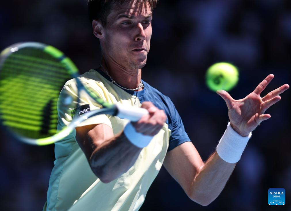 Fabian Marozsan of Hungary hits a return during the men's singles 3rd round match against Daniil Medvedev of Russia at the Australian Open tennis tournament in Melbourne, Australia, Jan. 23, 2026. (Xinhua/Ma Ping)