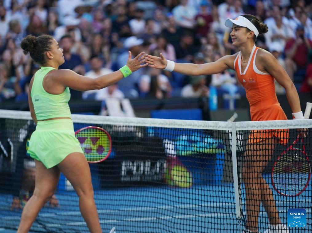 Jasmine Paolini (L) of Italy and Iva Jovic of the United States shake hands after their women's singles 3rd round match at the Australian Open tennis tournament in Melbourne, Australia, Jan. 23, 2026. (Photo by Wang Shen/Xinhua)