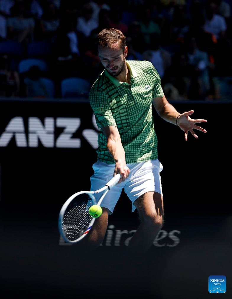 Daniil Medvedev of Russia hits a return during the men's singles 3rd round match against Fabian Marozsan of Hungary at the Australian Open tennis tournament in Melbourne, Australia, Jan. 23, 2026. (Xinhua/Ma Ping)
