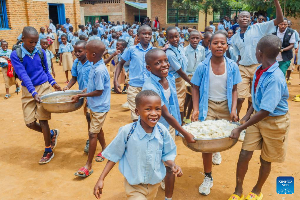 Children carry beans and rice dishes to their classroom for lunch at a school in Bugesera District, Eastern Province in Rwanda, on Jan. 20, 2026. Under a children-supporting program launched in 2023, children here are offered meals in schools to address their nutrition problems. (Photo by Cyril Ndegeya/Xinhua)