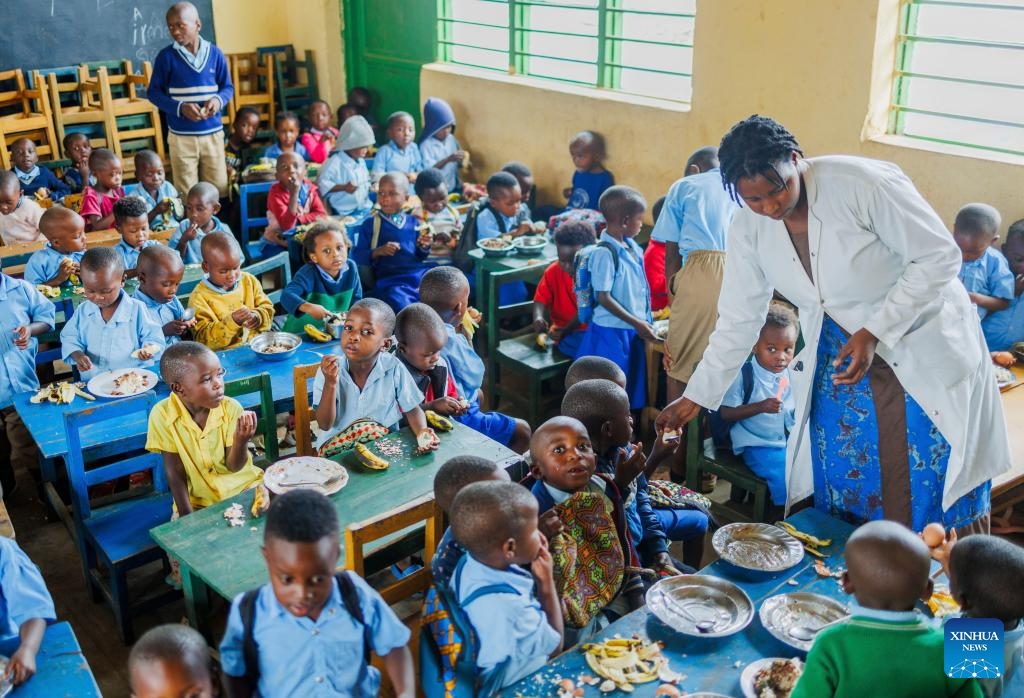 A teacher assists children to have their lunch at a classroom of a school in Bugesera District, Eastern Province in Rwanda, on Jan. 20, 2026. Under a children-supporting program launched in 2023, children here are offered meals in schools to address their nutrition problems. (Photo by Cyril Ndegeya/Xinhua)