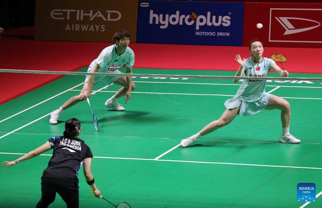 Jiang Zhenbang/Wei Yaxin (R) of China compete during the mixed doubles quarterfinal match between Jiang Zhenbang/Wei Yaxin of China and Adnan Maulana/Indah Cahya Sari Jamil of Indonesia at the Indonesia Masters 2026 badminton tournament in Jakarta, Indonesia, Jan. 23, 2026. (Xinhua/Cen Yunpeng)