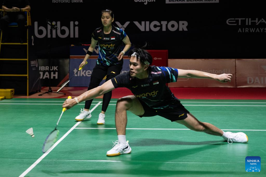 Adnan Maulana (L)/Indah Cahya Sari Jamil of Indonesia compete during the mixed doubles quarterfinal match between Jiang Zhenbang/Wei Yaxin of China and Adnan Maulana/Indah Cahya Sari Jamil of Indonesia at the Indonesia Masters 2026 badminton tournament in Jakarta, Indonesia, Jan. 23, 2026. (Xinhua/Veri Sanovri)