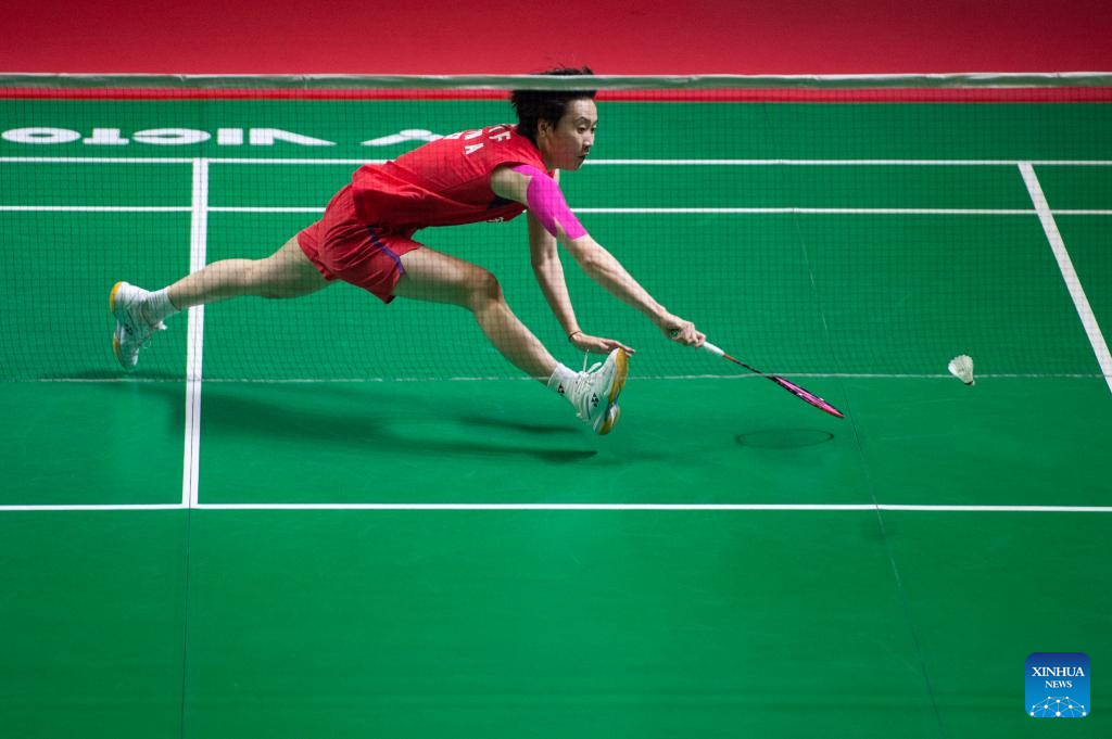 Chen Yufei of China hits a return during the women's singles quarterfinal match between Chen Yufei of China and Pusarla V. Sindhu of India at the Indonesia Masters 2026 badminton tournament in Jakarta, Indonesia, Jan. 23, 2026. (Xinhua/Cen Yunpeng)