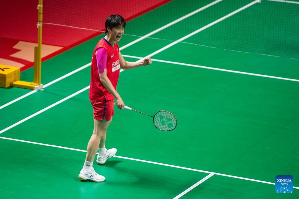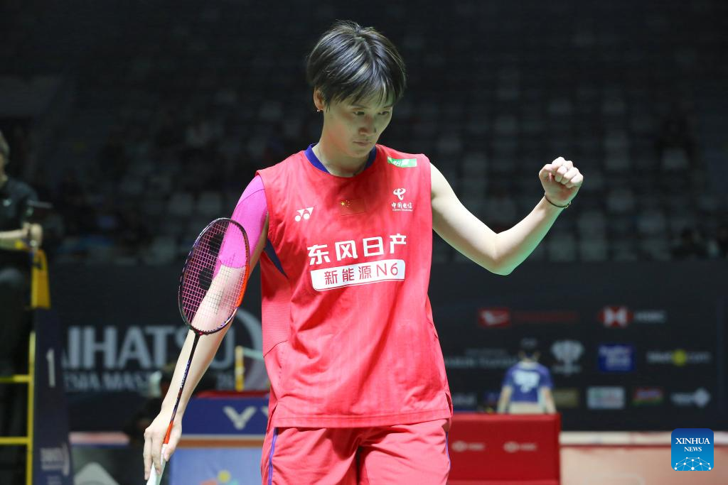 Chen Yufei of China celebrates scoring during the women's singles quarterfinal match between Chen Yufei of China and Pusarla V. Sindhu of India at the Indonesia Masters 2026 badminton tournament in Jakarta, Indonesia, Jan. 23, 2026. (Xinhua/Veri Sanovri)