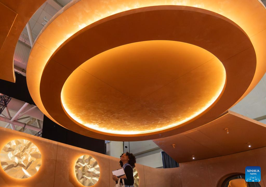 A woman looks up at a ceiling light during the Interior Design Show in Toronto, Canada, Jan. 22, 2026. The annual event kicked off here on Thursday and will run until Jan. 25. (Photo by Zou Zheng/Xinhua)