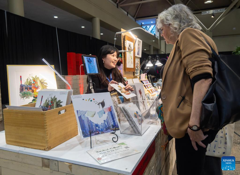 A woman browses design works during the Interior Design Show in Toronto, Canada, Jan. 22, 2026. The annual event kicked off here on Thursday and will run until Jan. 25. (Photo by Zou Zheng/Xinhua)