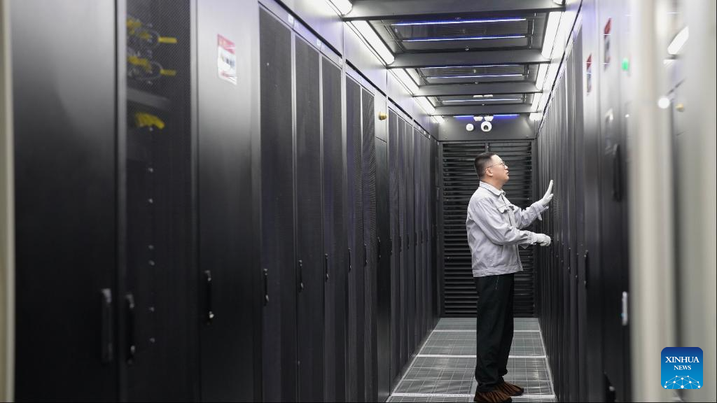 An employee conducts maintenance at a server room of the China Mobile Hohhot Data Center in Hohhot, north China's Inner Mongolia Autonomous Region, on May 20, 2025. (Photo by Su Yali/Xinhua)