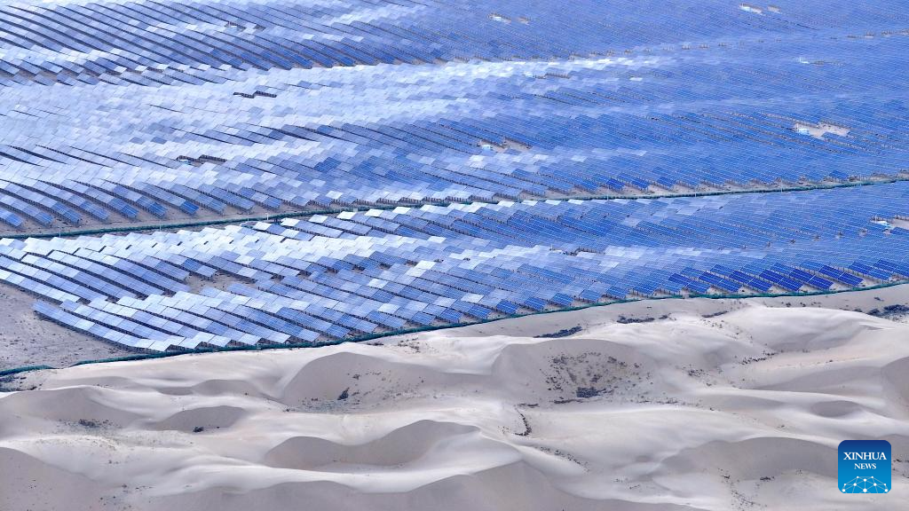 An aerial drone photo taken on May 17, 2025 shows a photovoltaic base with a capacity of one million kilowatts in Dalad Banner of Erdos, north China's Inner Mongolia Autonomous Region. (Photo by Yang Yaozhong/Xinhua)