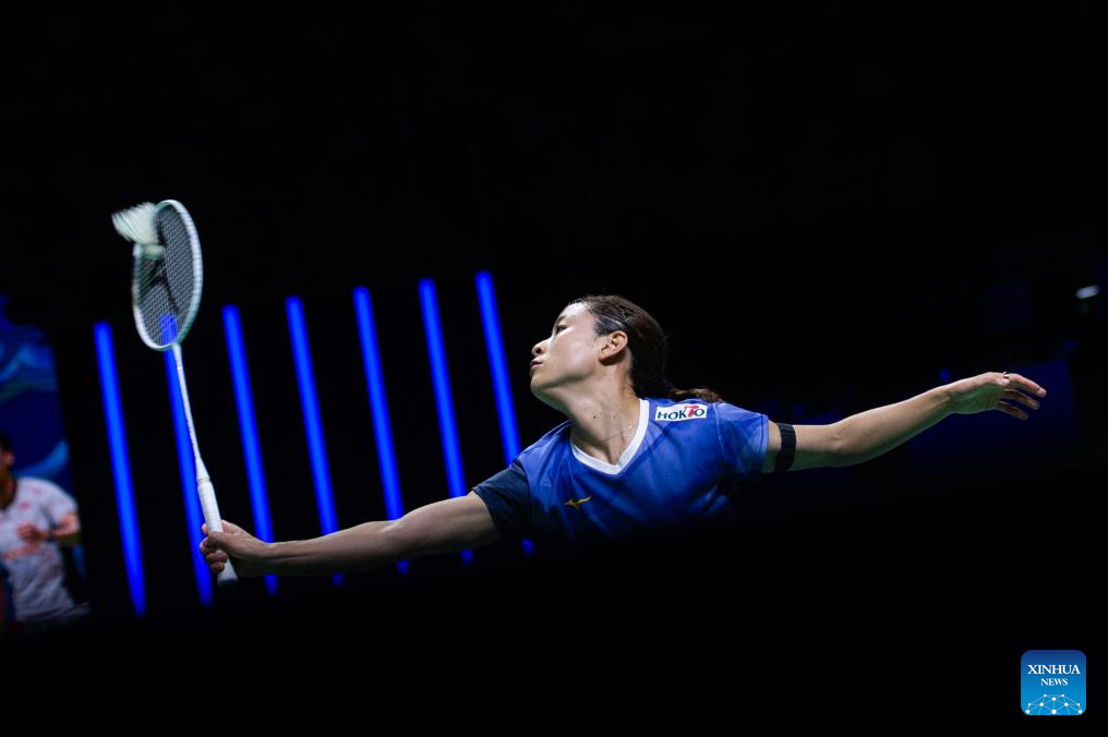 Okuhara Nozomi of Japan returns the shuttlecock during the women's singles semifinal match against Chen Yufei of China at the Indonesia Masters 2026 badminton tournament in Jakarta, Indonesia, Jan. 24, 2026. (Xinhua/Veri Sanovri)