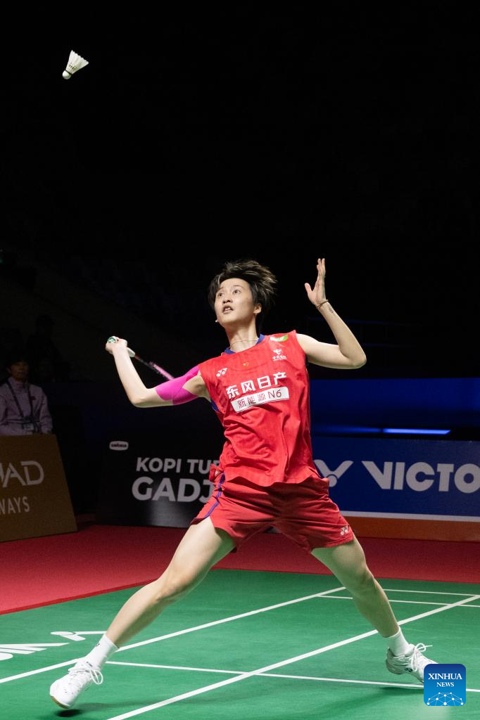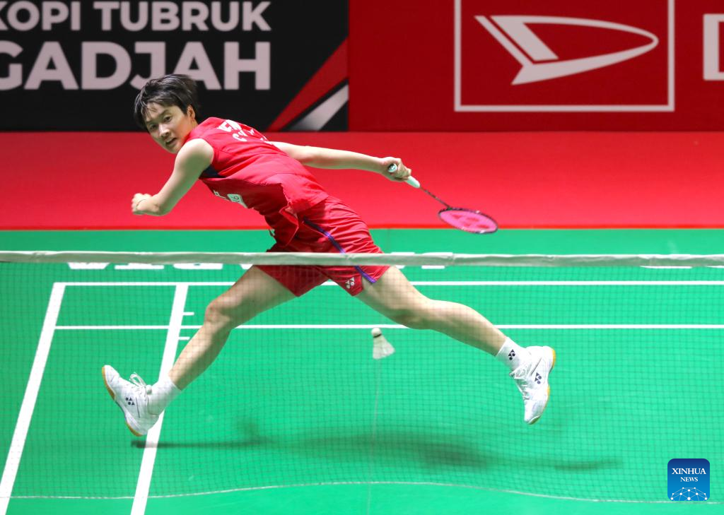 Chen Yufei of China returns the shuttlecock during the women's singles semifinal match against Okuhara Nozomi of Japan at the Indonesia Masters 2026 badminton tournament in Jakarta, Indonesia, Jan. 24, 2026. (Xinhua/Veri Sanovri)