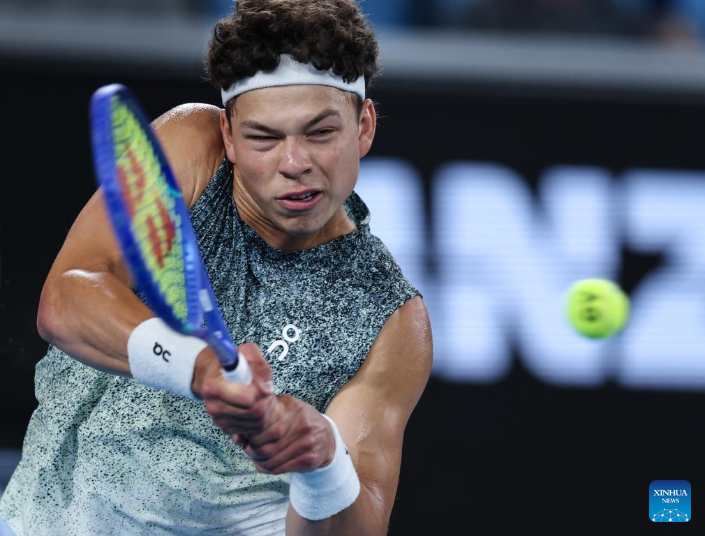 Ben Shelton of the United States hits a return during the men's singles 3rd round match against Valentin Vacherot of Monaco at the Australian Open 2026 tennis tournament in Melbourne, Australia, Jan. 24, 2026. (Xinhua/Ma Ping)
