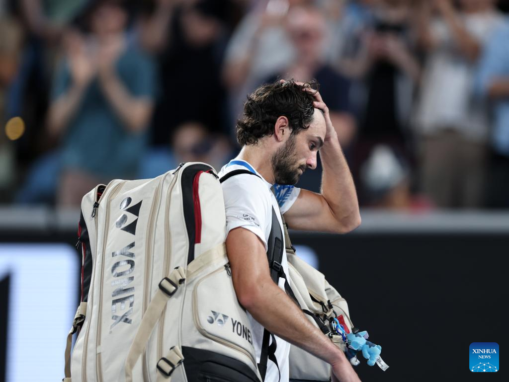Valentin Vacherot of Monaco leaves the court after the men's singles 3rd round match against Ben Shelton of the United States at the Australian Open 2026 tennis tournament in Melbourne, Australia, Jan. 24, 2026. (Xinhua/Ma Ping)