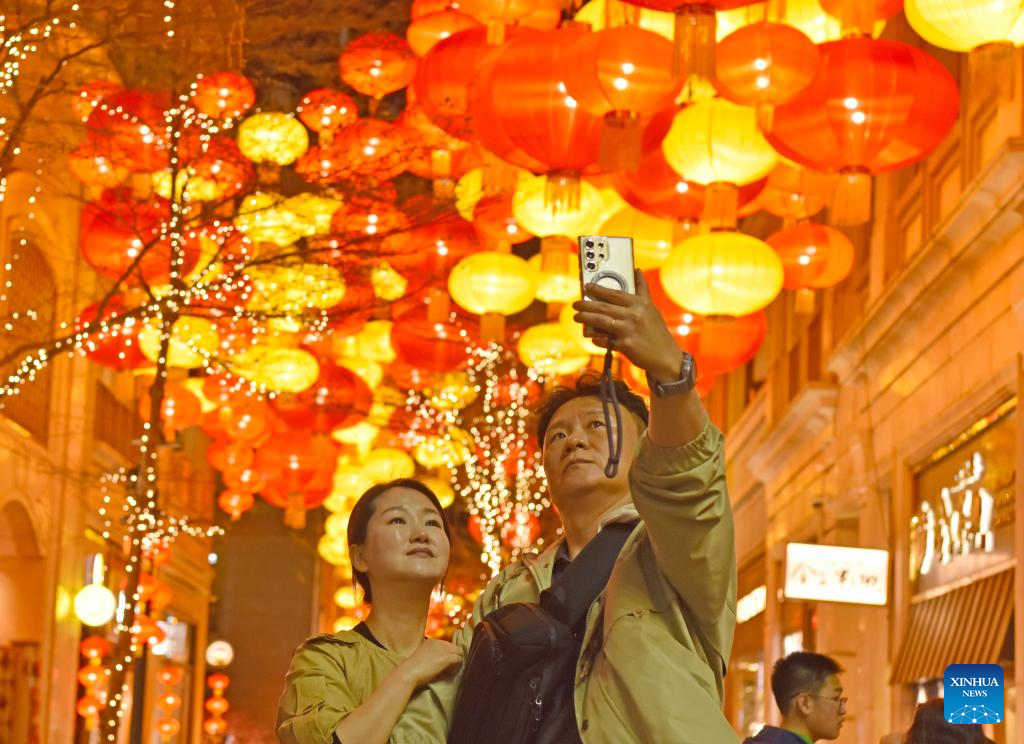 People take selfies with festive lanterns on Lee Tung Street in Hong Kong, south China, on Feb. 5, 2026. These lanterns are hoisted to mark the upcoming Chinese New Year. (Xinhua/Chen Duo)