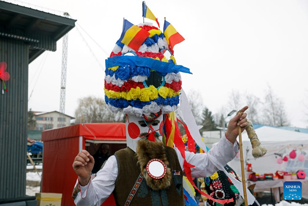 A man carries his mask during the annual "Cuckoo's Day" (Ziua Cucilor) festival in Branesti, near Bucharest, capital of Romania, on Feb. 23, 2026. Groups of masked people took part in the traditional festival, singing and dancing for good health and fertility at the beginning of spring. (Photo by Cristian Cristel/Xinhua)