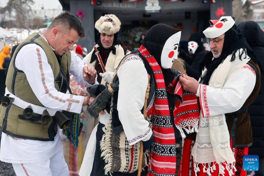 People prepare for the annual "Cuckoo's Day" (Ziua Cucilor) festival in Branesti, near Bucharest, capital of Romania, on Feb. 23, 2026. Groups of masked people took part in the traditional festival, singing and dancing for good health and fertility at the beginning of spring. (Photo by Cristian Cristel/Xinhua)