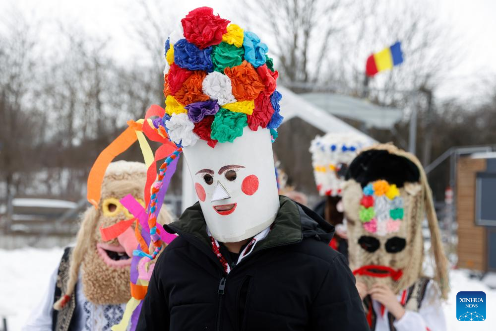 Masked people participate in the annual "Cuckoo's Day" (Ziua Cucilor) festival in Branesti, near Bucharest, capital of Romania, on Feb. 23, 2026. Groups of masked people took part in the traditional festival, singing and dancing for good health and fertility at the beginning of spring. (Photo by Cristian Cristel/Xinhua)
