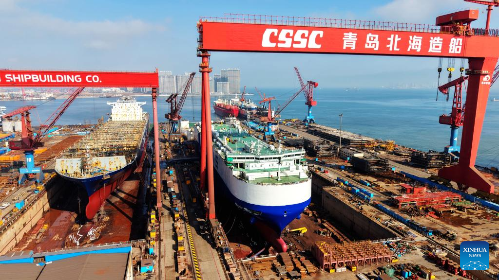 An aerial drone photo taken on Feb. 25, 2026 shows the Haixi Bay Shipbuilding and Marine Engineering Industrial Base in Qingdao, east China's Shandong Province. As production resumes after the Spring Festival holiday, factories and enterprises across the country are operating at full steam to meet orders and ramp up output. (Photo by Yu Fangping/Xinhua)