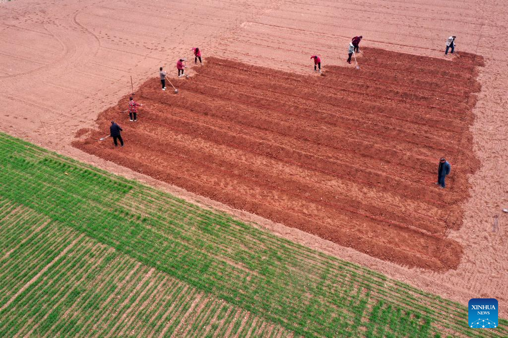 An aerial drone photo taken on Feb. 25, 2026 shows farmers working in the fields of Dongwangqu Village, Qinyang City, central China's Henan Province. After the Spring Festival holiday, farmers are busy with agricultural production in the farming season across the country. (Photo by Yang Fan/Xinhua)