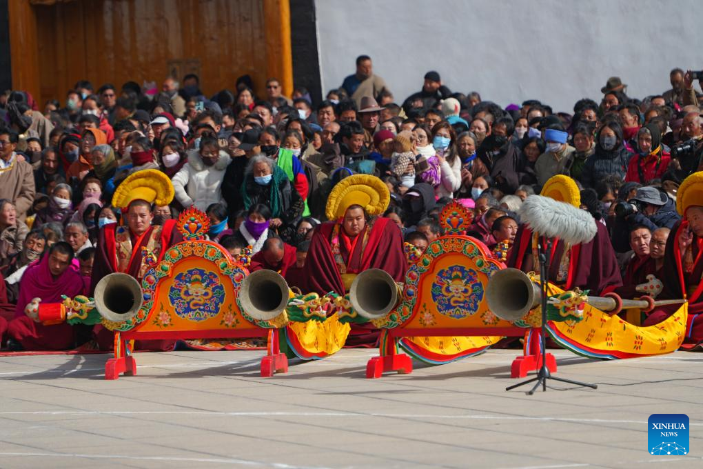 Lamas play traditional musical instruments during an exorcism dance performance in a square at the Labrang Monastery in Xiahe County, northwest China's Gansu Province, on March 2, 2026. The annual event of exorcism dance to pray for good luck in the new year was held here on Monday. Built in 1709, Labrang Monastery is one of the six great monasteries of the Gelug Sect of Tibetan Buddhism. (Xinhua/Liu Keying)