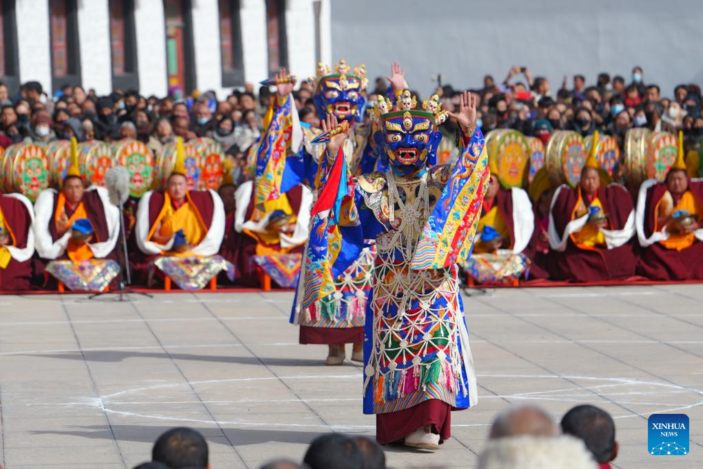 This photo taken on March 2, 2026 shows an event of exorcism dance at the Labrang Monastery in Xiahe County, northwest China's Gansu Province. The annual event of exorcism dance to pray for good luck in the new year was held here on Monday. Built in 1709, Labrang Monastery is one of the six great monasteries of the Gelug Sect of Tibetan Buddhism. (Xinhua/Liu Keying)