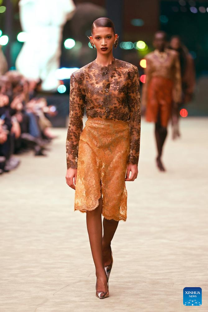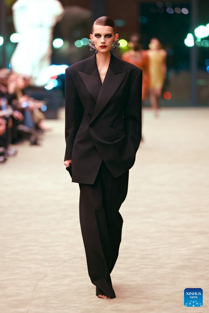 A model presents a creation from the ready-to-wear Fall/Winter 2026-2027 collections by Saint Laurent during the Paris Fashion Week in Paris, France, on March 3, 2026. (MeetEurope/Handout via Xinhua)