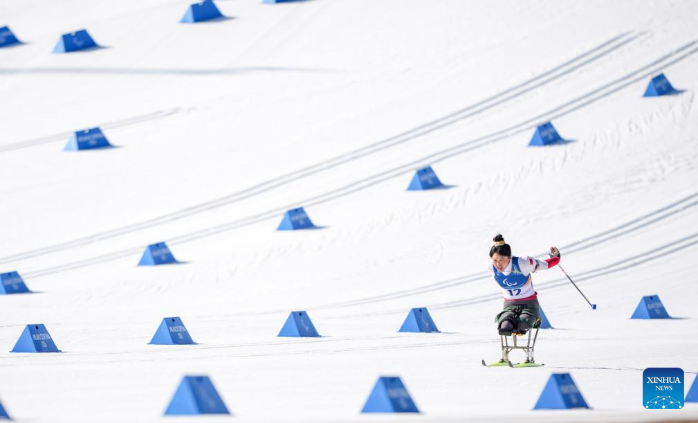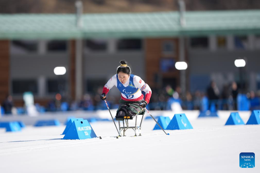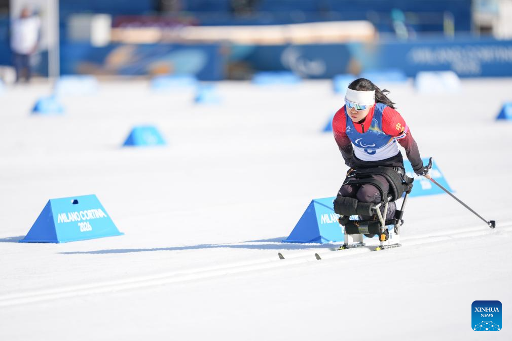 Zhai Yuxin of China competes during the women's individual sitting final of para biathon at the Milan-Cortina 2026 Paralympic Winter Games in Tesero, Italy, March 8, 2026. (Xinhua/Lian Zhen)