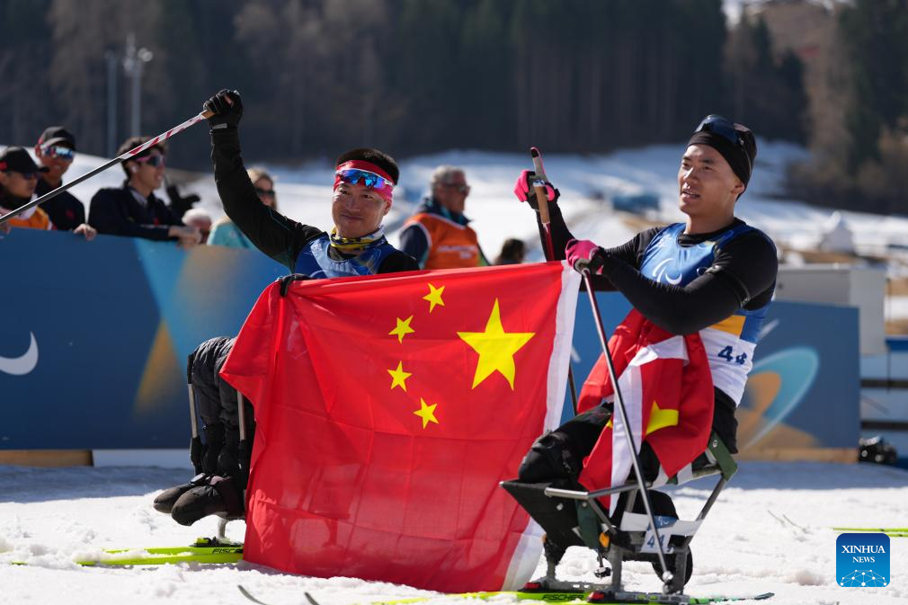 Liu Zixu (R) and Mao Zhongwu of China celebrate after the men's individual sitting final of para biathon at the Milan-Cortina 2026 Paralympic Winter Games in Tesero, Italy, March 8, 2026. (Xinhua/Lian Zhen)