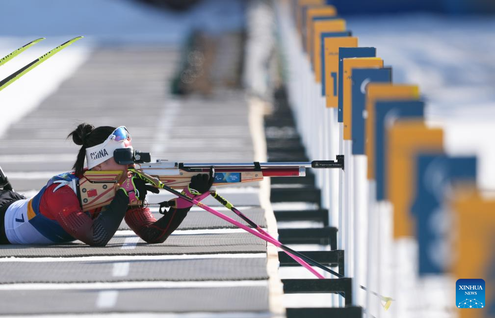 Shan Yilin of China shoots during the women's individual sitting final of para biathon at the Milan-Cortina 2026 Paralympic Winter Games in Tesero, Italy, March 8, 2026. (Xinhua/Lian Zhen)
