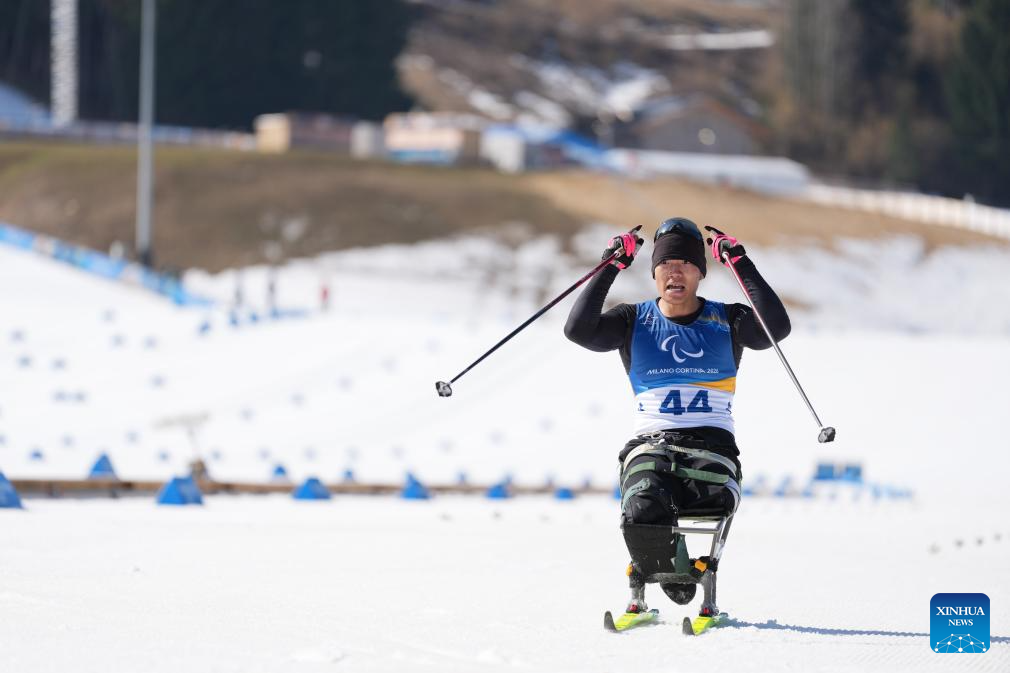Mao Zhongwu of China competes during the men's individual sitting final of para biathon at the Milan-Cortina 2026 Paralympic Winter Games in Tesero, Italy, March 8, 2026. (Xinhua/Lian Zhen)