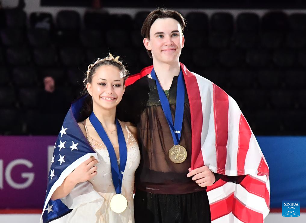 Gold medalists Hana Maria Aboian (L)/Daniil Veselukhin of the United States pose for photos during the award ceremony for the free dance of Ice Dance at ISU Figure Skating Junior World Championships in Tallinn, Estonia, March 7, 2026. (Photo by Sergei Stepanov/Xinhua)