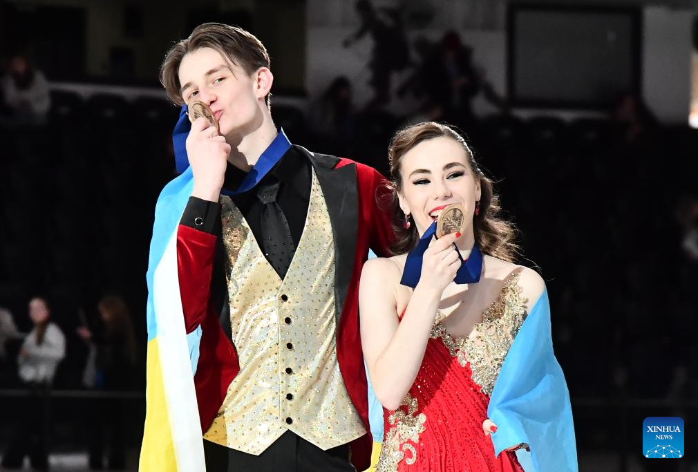 Bronze medalists Iryna Pidgaina (R)/Artem Koval of Ukraine pose for photos during the award ceremony for the free dance of Ice Dance at ISU Figure Skating Junior World Championships in Tallinn, Estonia, March 7, 2026. (Photo by Sergei Stepanov/Xinhua)
