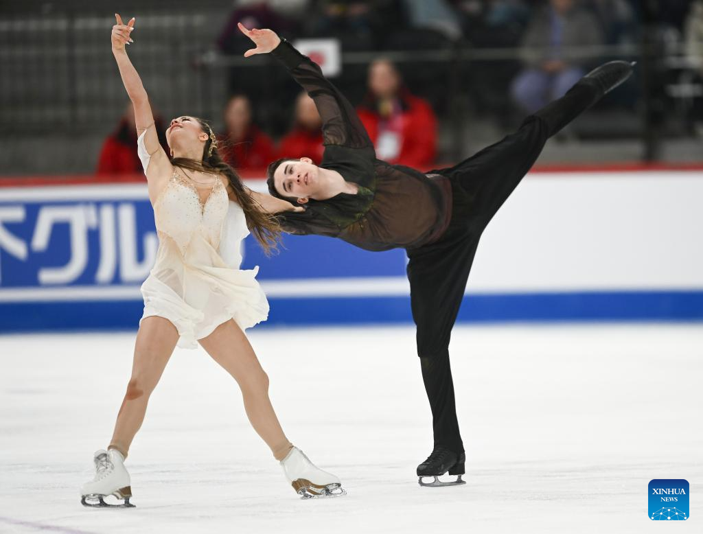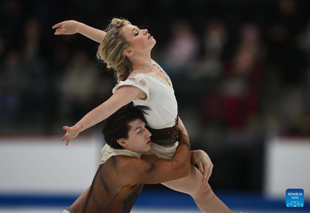 Ambre Perrier Gianesini (R)/Samuel Blanc Klaperman of France compete during the free dance of Ice Dance at ISU Figure Skating Junior World Championships in Tallinn, Estonia, March 7, 2026. (Photo by Sergei Stepanov/Xinhua)