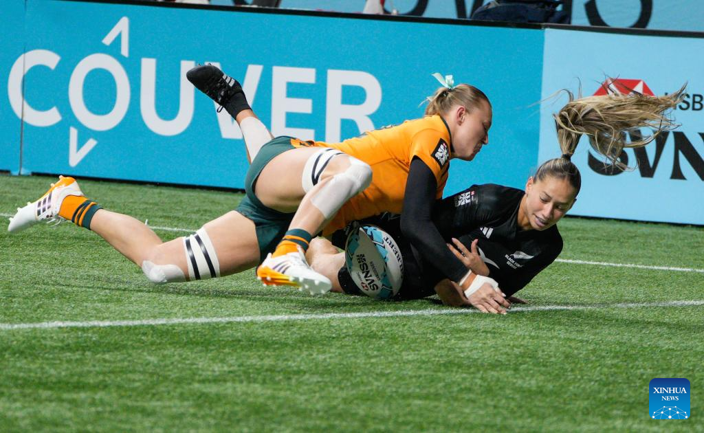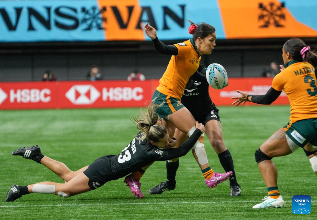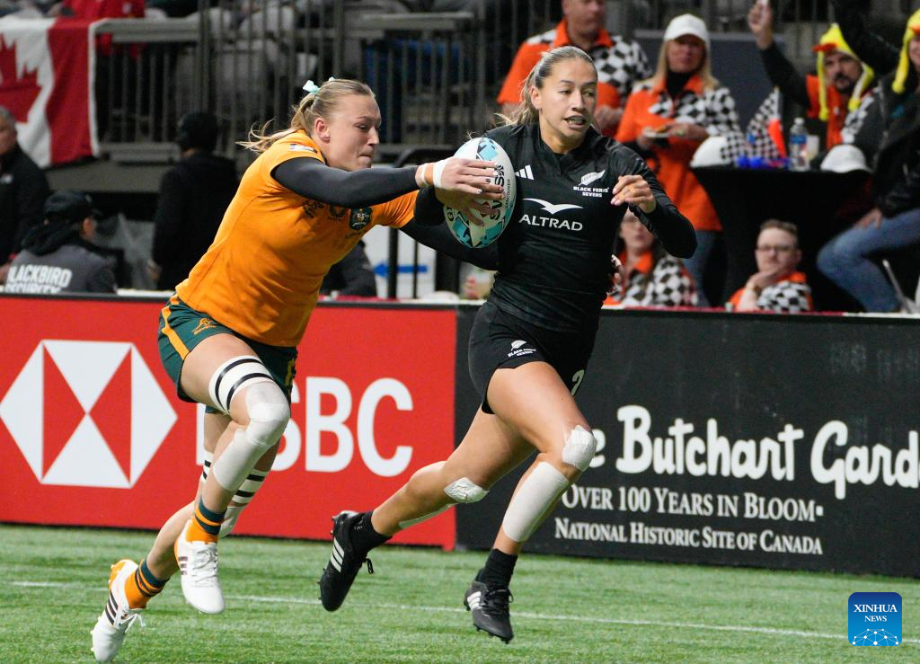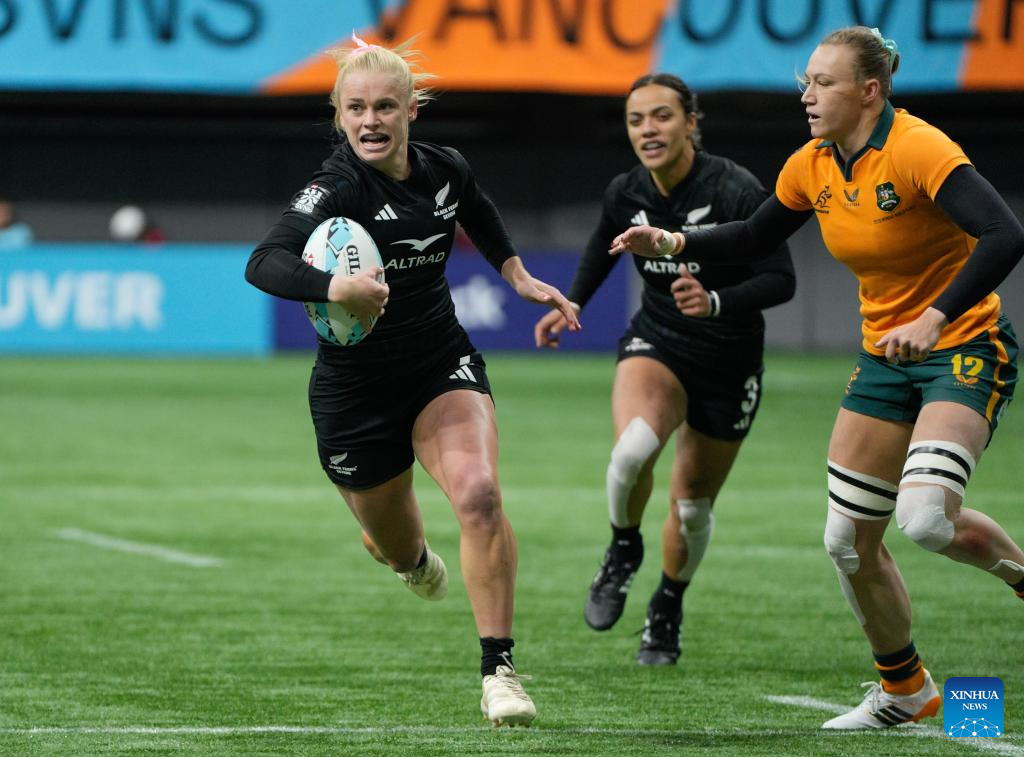 Players compete during the Women's Cup Final match between Australia and New Zealand at 2026 World Rugby Sevens Series in Vancouver, Canada, on March 8, 2026. (Photo by Liang Sen/Xinhua)