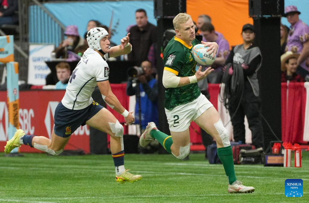 Ryan Oosthuizen (R) of South Africa runs the ball to score, as Jaime Manteca of Spain trying to stop him during the Men's Cup Final match between South Africa and Spain at 2026 World Rugby Sevens Series in Vancouver, British Columbia, Canada, on March 8, 2026. (Photo by Liang Sen/Xinhua)