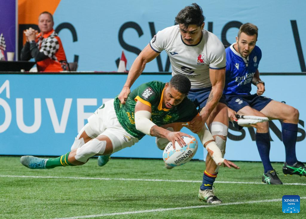Shilton van Wyk (L) of South Africa scores under the defence of Jeremy Trevithick (C) of Spain during the Men's Cup Final match between South Africa and Spain at 2026 World Rugby Sevens Series in Vancouver, British Columbia, Canada, on March 8, 2026. (Photo by Liang Sen/Xinhua)