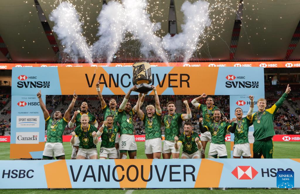 Team South Africa celebrate with the trophy after the Men's Cup Final match between South Africa and Spain at 2026 World Rugby Sevens Series in Vancouver, British Columbia, Canada, on March 8, 2026. (Photo by Liang Sen/Xinhua)