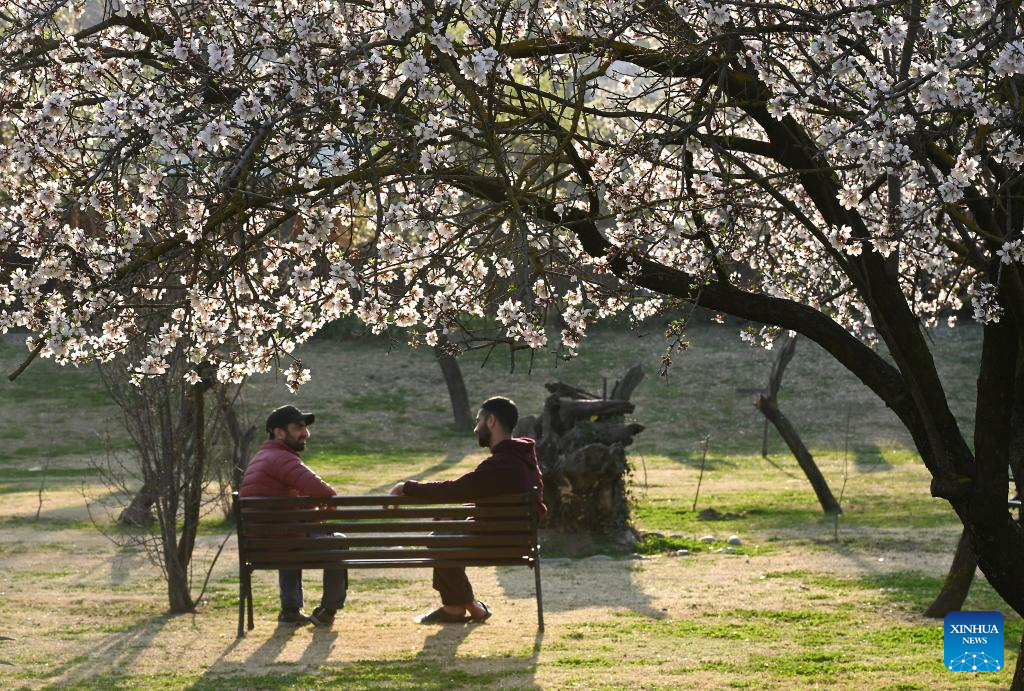 People sit on a bench amid almond trees in full bloom at a park in Srinagar, the summer capital of Indian-controlled Kashmir, on March 8, 2026. (Xinhua/Javed Dar)
