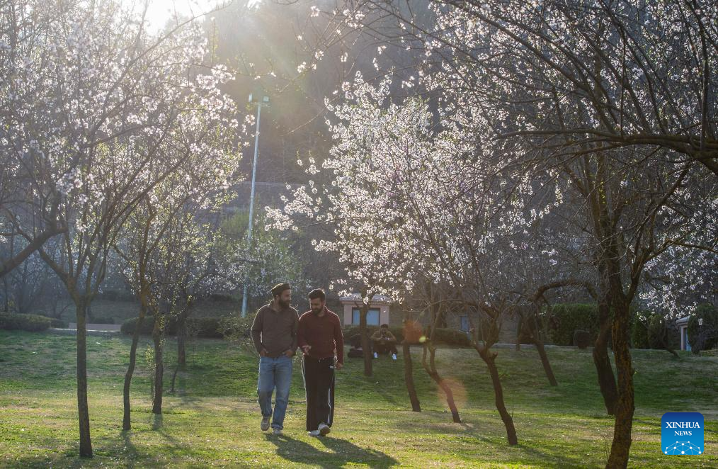 People stroll amid almond trees in full bloom at a park in Srinagar, the summer capital of Indian-controlled Kashmir, on March 8, 2026. (Xinhua/Javed Dar)