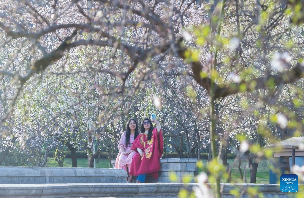 Tourists take a selfie amid almond trees in full bloom at a park in Srinagar, the summer capital of Indian-controlled Kashmir, on March 8, 2026. (Xinhua/Javed Dar)