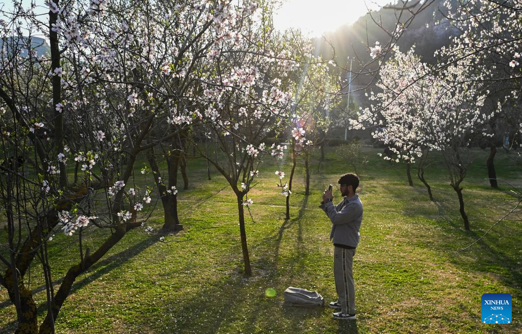 A man takes photos of almond trees in full bloom at a park in Srinagar, the summer capital of Indian-controlled Kashmir, on March 8, 2026. (Xinhua/Javed Dar)